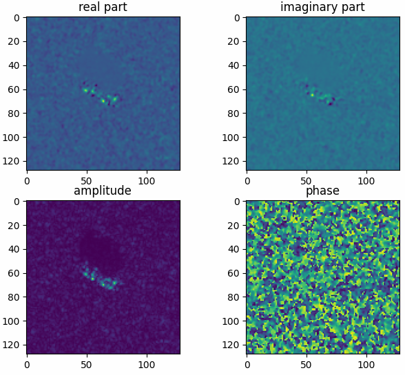 import pyaibox as pb import matplotlib.pyplot as plt filepath = datapath + 'BTR70_HB03787.004' x = pb.mstar_raw(filepath, ofmt='c') print(x.shape, np.max(x), np.min(x)) plt.figure() plt.subplot(221) plt.imshow(x.real) plt.title('real part') plt.subplot(222) plt.imshow(x.imag) plt.title('imaginary part') plt.subplot(223) plt.imshow(np.abs(x)) plt.title('amplitude') plt.subplot(224) plt.imshow(np.angle(x)) plt.title('phase') plt.show()
