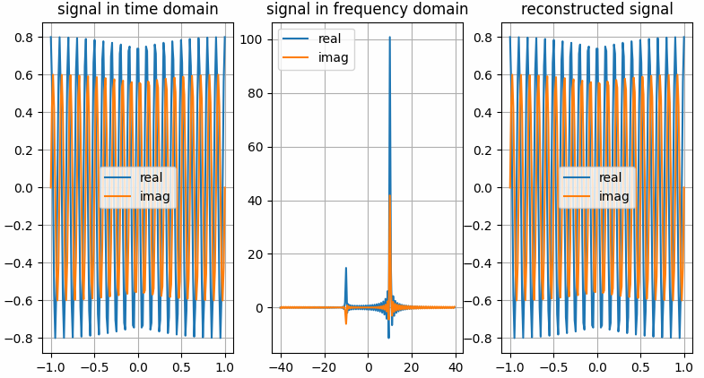 import numpy as np import pyaibox as pb import matplotlib.pyplot as plt shift = True frq = [10, 10] amp = [0.8, 0.6] Fs = 80 Ts = 2. Ns = int(Fs * Ts) t = np.linspace(-Ts / 2., Ts / 2., Ns).reshape(Ns, 1) f = pb.freq(Ns, Fs, shift=shift) f = pb.fftfreq(Ns, Fs, norm=False, shift=shift) # ---complex vector in real representation format x = amp[0] * np.cos(2. * np.pi * frq[0] * t) + 1j * amp[1] * np.sin(2. * np.pi * frq[1] * t) # ---do fft Xc = pb.fft(x, n=Ns, caxis=None, axis=0, keepcaxis=False, shift=shift) # ~~~get real and imaginary part xreal = pb.real(x, caxis=None, keepcaxis=False) ximag = pb.imag(x, caxis=None, keepcaxis=False) Xreal = pb.real(Xc, caxis=None, keepcaxis=False) Ximag = pb.imag(Xc, caxis=None, keepcaxis=False) # ---do ifft x̂ = pb.ifft(Xc, n=Ns, caxis=None, axis=0, keepcaxis=False, shift=shift) # ~~~get real and imaginary part x̂real = pb.real(x̂, caxis=None, keepcaxis=False) x̂imag = pb.imag(x̂, caxis=None, keepcaxis=False) plt.figure() plt.subplot(131) plt.grid() plt.plot(t, xreal) plt.plot(t, ximag) plt.legend(['real', 'imag']) plt.title('signal in time domain') plt.subplot(132) plt.grid() plt.plot(f, Xreal) plt.plot(f, Ximag) plt.legend(['real', 'imag']) plt.title('signal in frequency domain') plt.subplot(133) plt.grid() plt.plot(t, x̂real) plt.plot(t, x̂imag) plt.legend(['real', 'imag']) plt.title('reconstructed signal') plt.show() # ---complex vector in real representation format x = pb.c2r(x, caxis=-1) # ---do fft Xc = pb.fft(x, n=Ns, caxis=-1, axis=0, keepcaxis=False, shift=shift) # ~~~get real and imaginary part xreal = pb.real(x, caxis=-1, keepcaxis=False) ximag = pb.imag(x, caxis=-1, keepcaxis=False) Xreal = pb.real(Xc, caxis=-1, keepcaxis=False) Ximag = pb.imag(Xc, caxis=-1, keepcaxis=False) # ---do ifft x̂ = pb.ifft(Xc, n=Ns, caxis=-1, axis=0, keepcaxis=False, shift=shift) # ~~~get real and imaginary part x̂real = pb.real(x̂, caxis=-1, keepcaxis=False) x̂imag = pb.imag(x̂, caxis=-1, keepcaxis=False) plt.figure() plt.subplot(131) plt.grid() plt.plot(t, xreal) plt.plot(t, ximag) plt.legend(['real', 'imag']) plt.title('signal in time domain') plt.subplot(132) plt.grid() plt.plot(f, Xreal) plt.plot(f, Ximag) plt.legend(['real', 'imag']) plt.title('signal in frequency domain') plt.subplot(133) plt.grid() plt.plot(t, x̂real) plt.plot(t, x̂imag) plt.legend(['real', 'imag']) plt.title('reconstructed signal') plt.show()